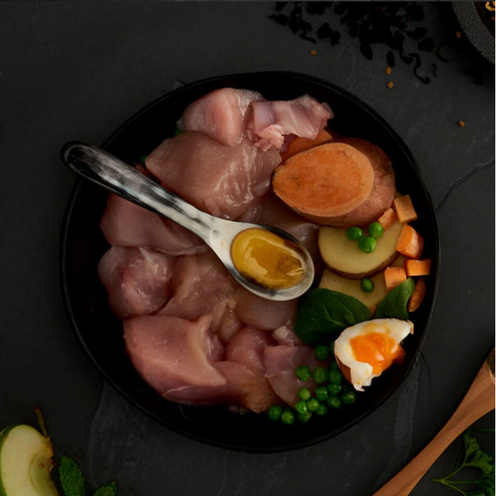 Свежо подготвена мисирка (30%), сушено пилешко (22.5%), сладок компир, компир, сушена мисирка (8%), грашок, пилешка маст (4%), луцерка, сушено јајце (3%), пилешки сос (1.5%), масло од лосос (1%), минерали, ProDen PlaqueOff (2,500 mg/kg), фруктолигосахариди, нане, магдонос, јаболко, морков, спанаќ, псилиум, морска трева, камилица, невен, брусница, анасон и фенугрик.